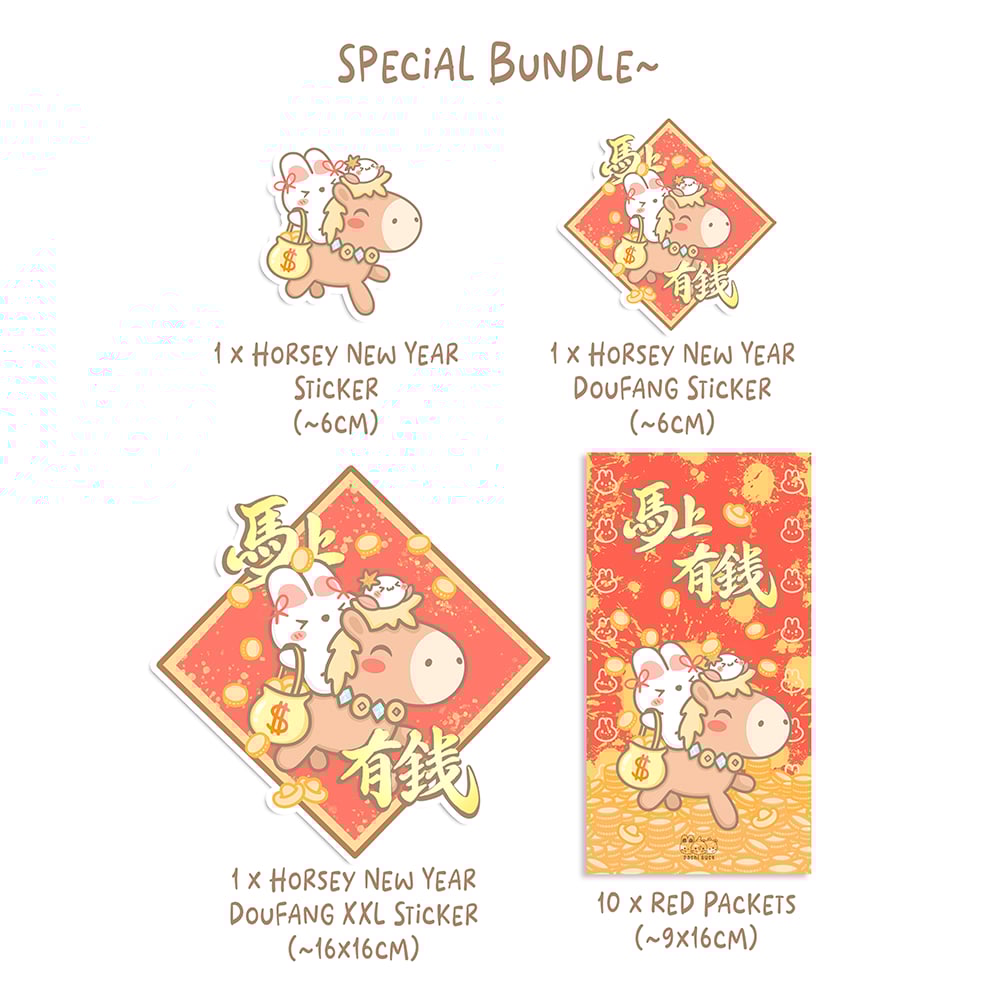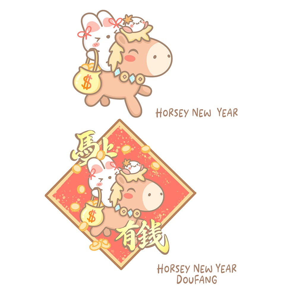 Have a Horsey New Year this lunar new year with Bunbun & Chi on their new friend~ Wishing everyone a prosperous new year!! There is a special bundle that comes with 10 red packets, 2 x normal sized stickers & 1 x xxl sized sticker~ All stickers in this series come with full glitter finishing!! However you can also get them separately, with some red packets bundles in bulk. Each red packet bundle comes with a random sticker too!!